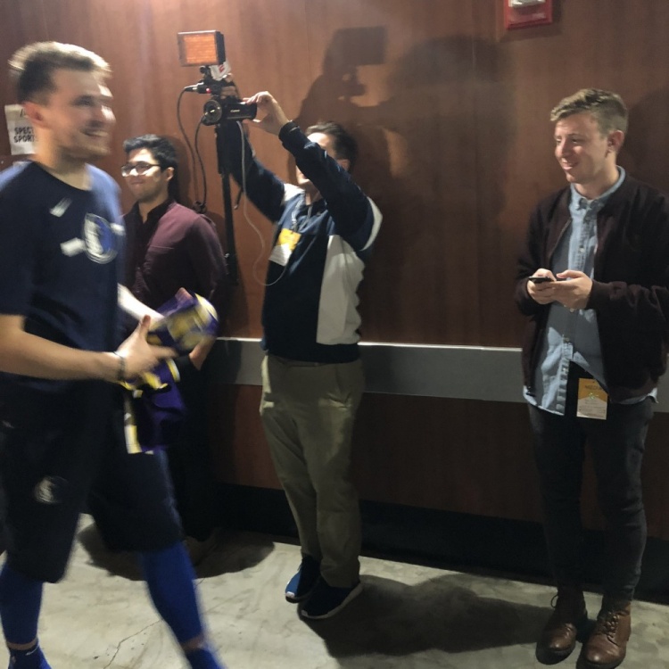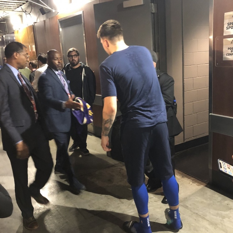 湖記Dave McMenamin更推曬照:“這些模糊的照片拍攝于2018年11月1日,菜鳥(niǎo)賽季的東契奇首次打完湖人后索要詹姆斯球衣,隨后東契奇前往湖人更衣室從保安手中拿到了球衣?!?/p>