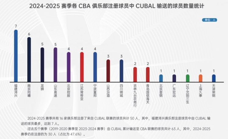 其中,本賽季各俱樂部中CUBAL輸送球員的統(tǒng)計(jì)情況如下。福建有7人最多、同曦6人第二,廣州和山東各5人。
