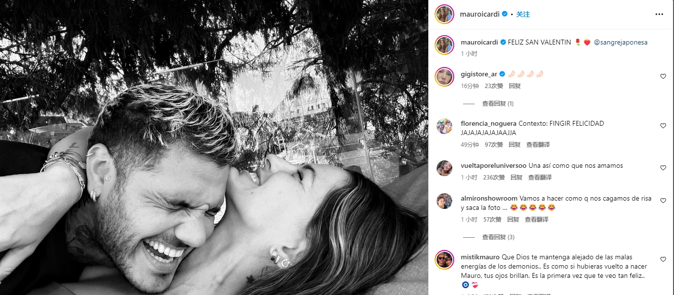 情人節(jié)之際,伊卡爾迪在社交媒體上曬出與新女友尤金妮婭的親密合照,配文:“情人節(jié)快樂!”