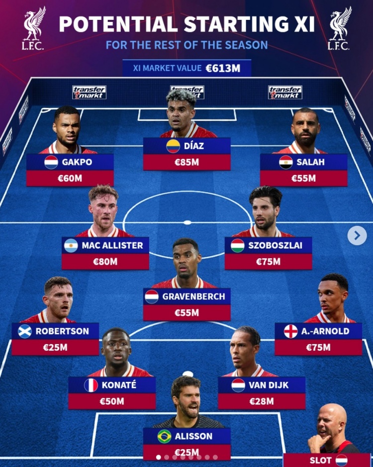 德轉(zhuǎn)預(yù)測(cè)利物浦下半程首發(fā)陣:總身價(jià)6.13億歐元