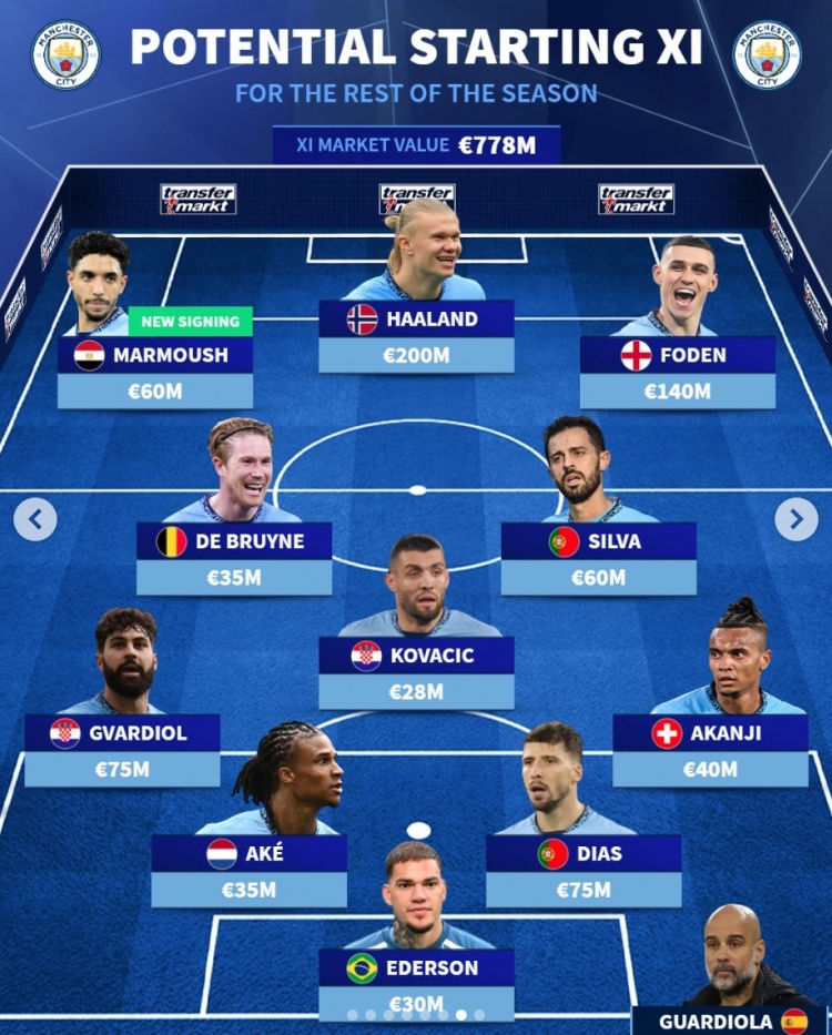 前鋒:馬爾穆什(6000萬(wàn))、哈蘭德(2億)、福登(1.4億)