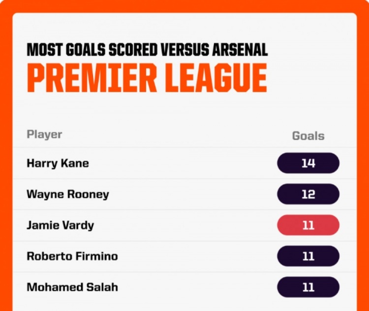 據(jù)Opta統(tǒng)計(jì),萊斯特城前鋒瓦爾迪英超對陣阿森納打進(jìn)11球,槍手是被他破門最多的球隊(duì),賽事歷史上僅少于凱恩和魯尼。