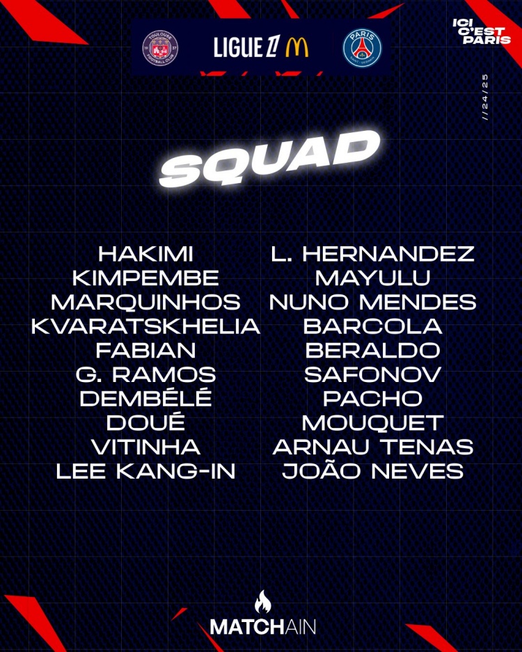 2月15日訊 北京時間明天凌晨,巴黎將在法甲第22輪比賽中客場對陣圖盧茲,巴黎公布了此役的球員名單,多納魯馬、扎伊爾埃梅里缺席。