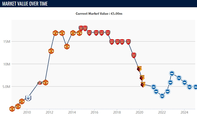 維爾貝克現(xiàn)年34歲,出自曼聯(lián)青訓,球員在2014年以2000萬歐元轉會費轉投阿森納。維爾貝克在2019年自由身轉會至沃特福德后,布萊頓于2020年10月將其簽下,并效力至今。本賽季這位英格蘭前鋒代表球隊英超出場19次,打進6球并有4次助攻。目前球員德轉身價為500萬歐元。