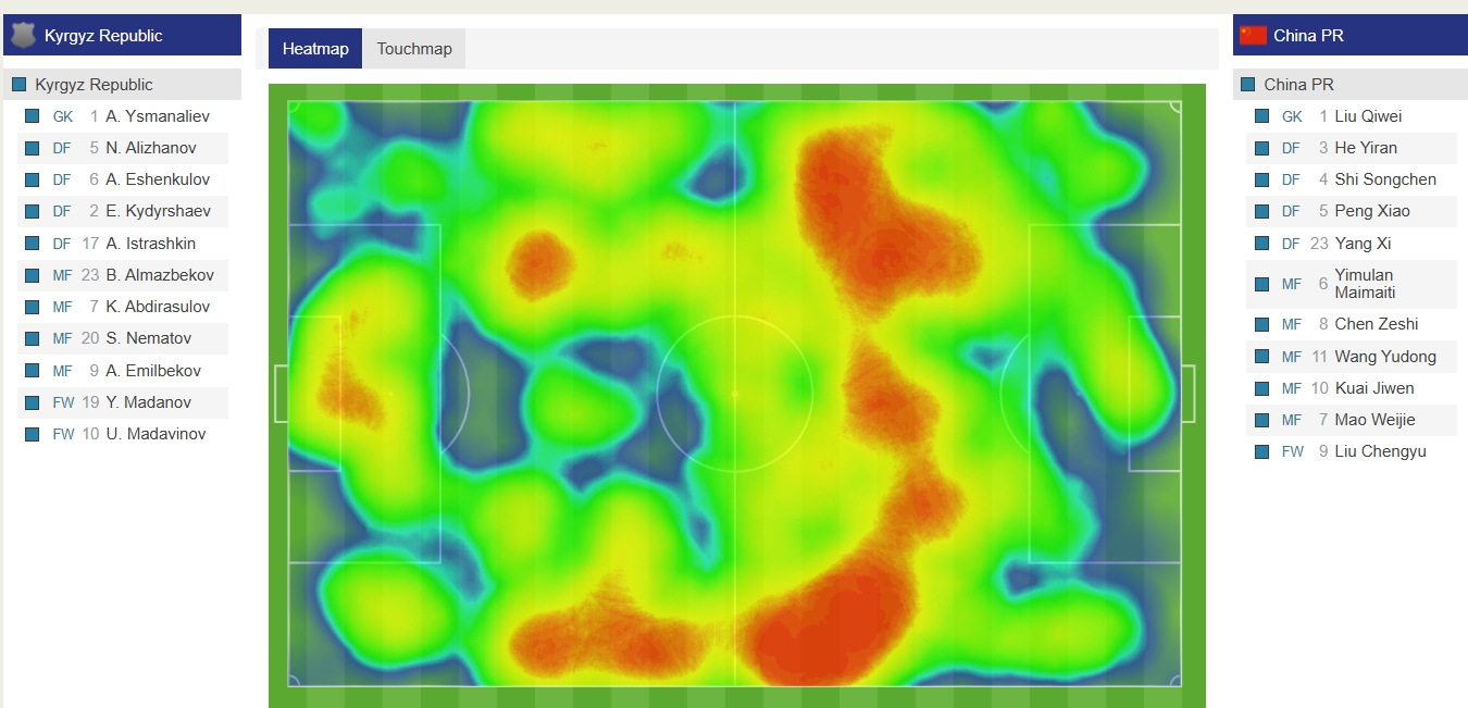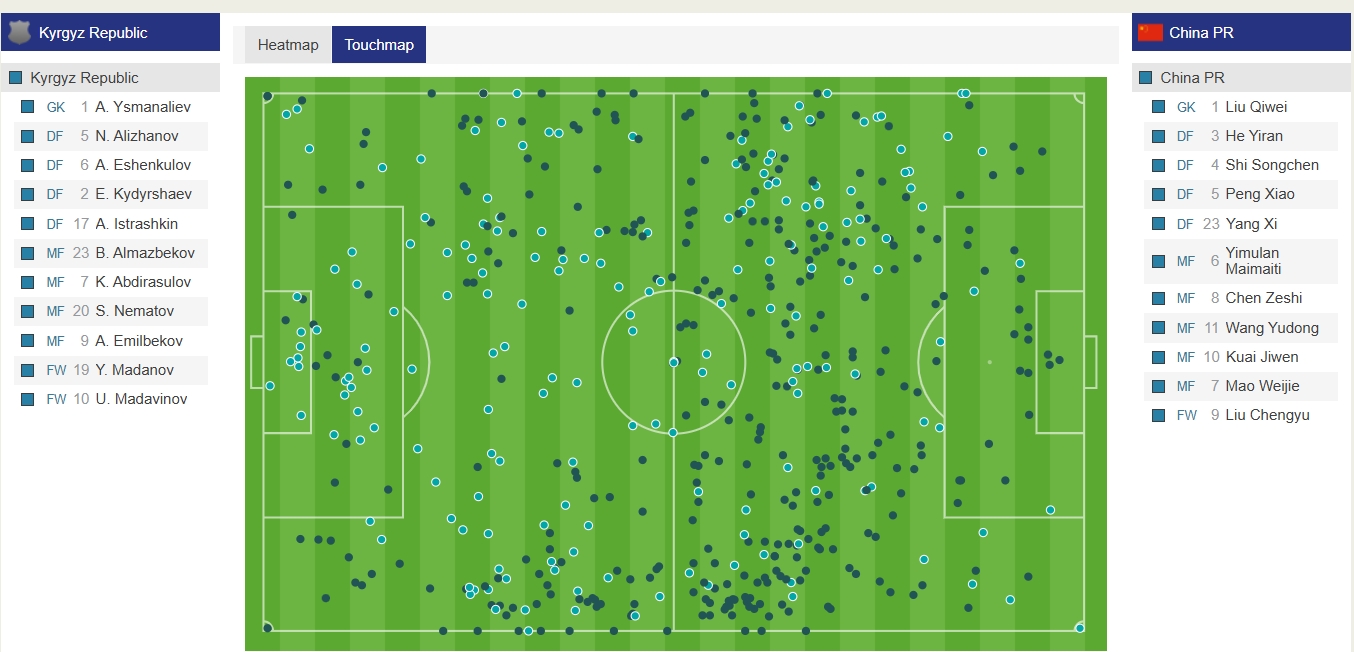 國青(深藍(lán))半場12次攻入對手禁區(qū),吉爾吉斯斯坦在國青禁區(qū)內(nèi)僅3次觸球