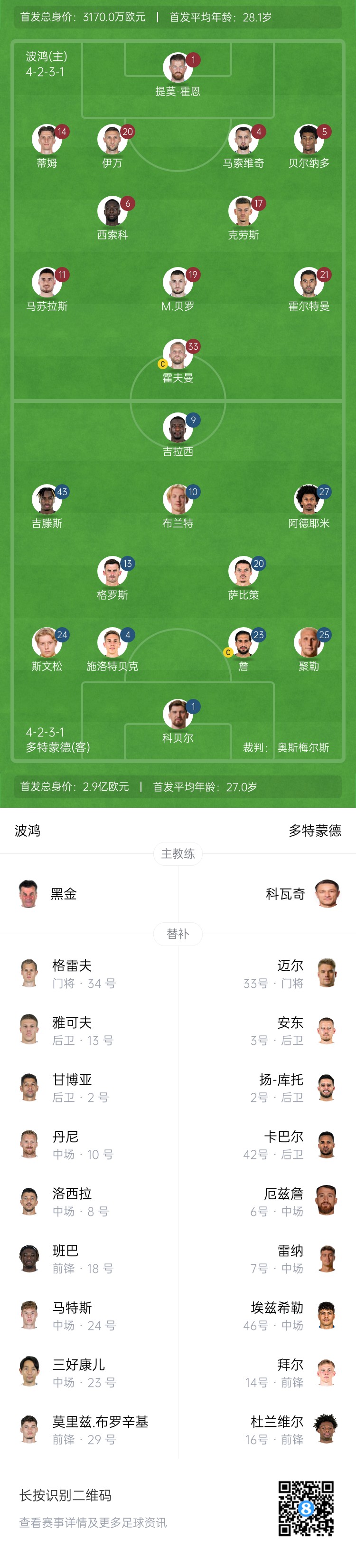 多特首發(fā):1-科貝爾、4-施洛特貝克、24-斯文松、25-聚勒、10-布蘭特、13-格羅斯、20-薩比策、23-埃姆雷-詹、9-吉拉西、27-阿德耶米、43-吉滕斯