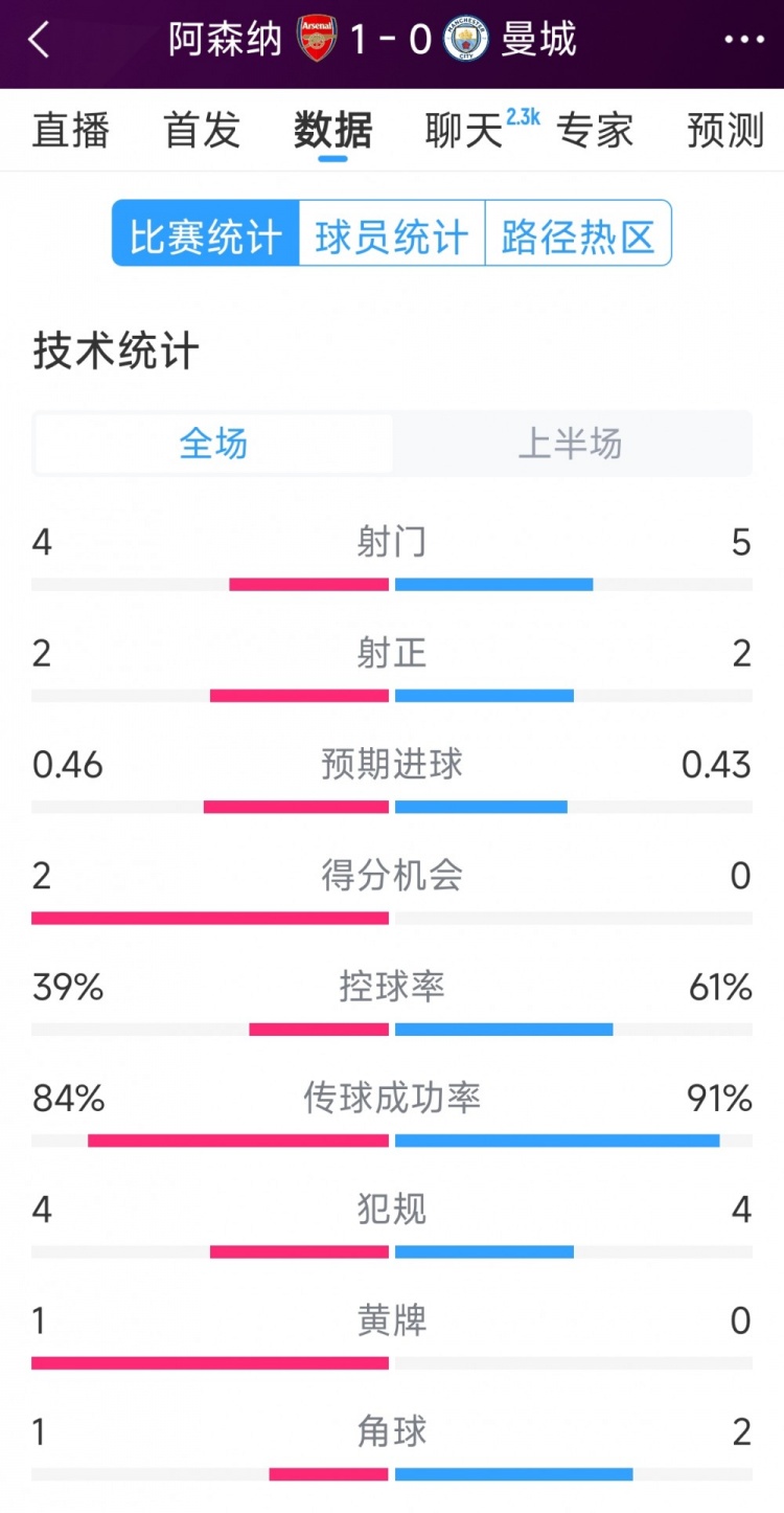 2月3日訊 在本輪英超焦點戰(zhàn),曼城對陣阿森納半場結(jié)束,阿森納憑借厄德高進球1-0領(lǐng)先。以下為雙方半場數(shù)據(jù)對比:
