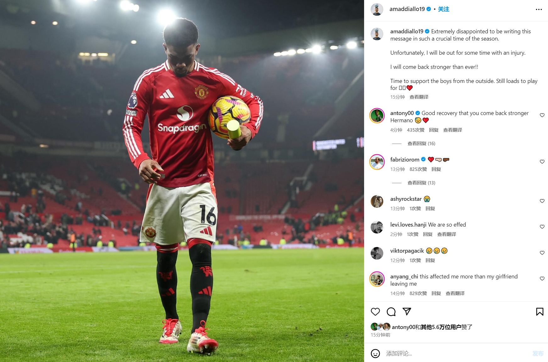 曼聯(lián)外租球員安東尼也安慰阿瑪?shù)拢盒值?,祝你康?fù)過程一切順利,希望復(fù)出時(shí)你能更加強(qiáng)大。