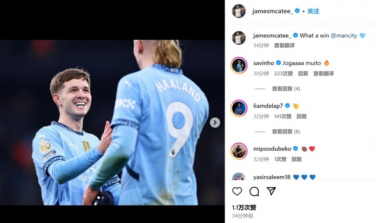 麥卡蒂也在賽后通過社媒曬出自己和哈蘭德慶祝進(jìn)球的合照,并配文:“多棒的一場勝利!@曼城俱樂部”。