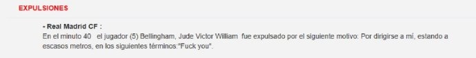 在賽后裁判報(bào)告中,談及貝林厄姆被紅牌罰下的原因:他在距離我僅數(shù)米遠(yuǎn)的地方,對(duì)我說(shuō)了“Fxxk you”。