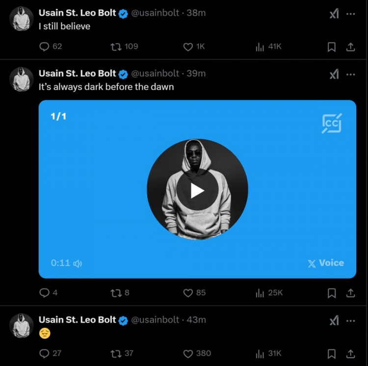 博爾特發(fā)了一個(gè)心情沮喪的表情包,然后寫道:黎明前總是黑暗的,我仍然有信心。