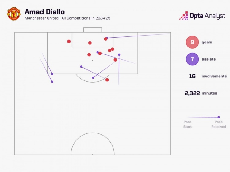 數(shù)據(jù)統(tǒng)計顯示,阿瑪?shù)卤举惣緸槁?lián)各項賽事共計直接參與16球,在隊內(nèi)僅次于參與21球的B費。