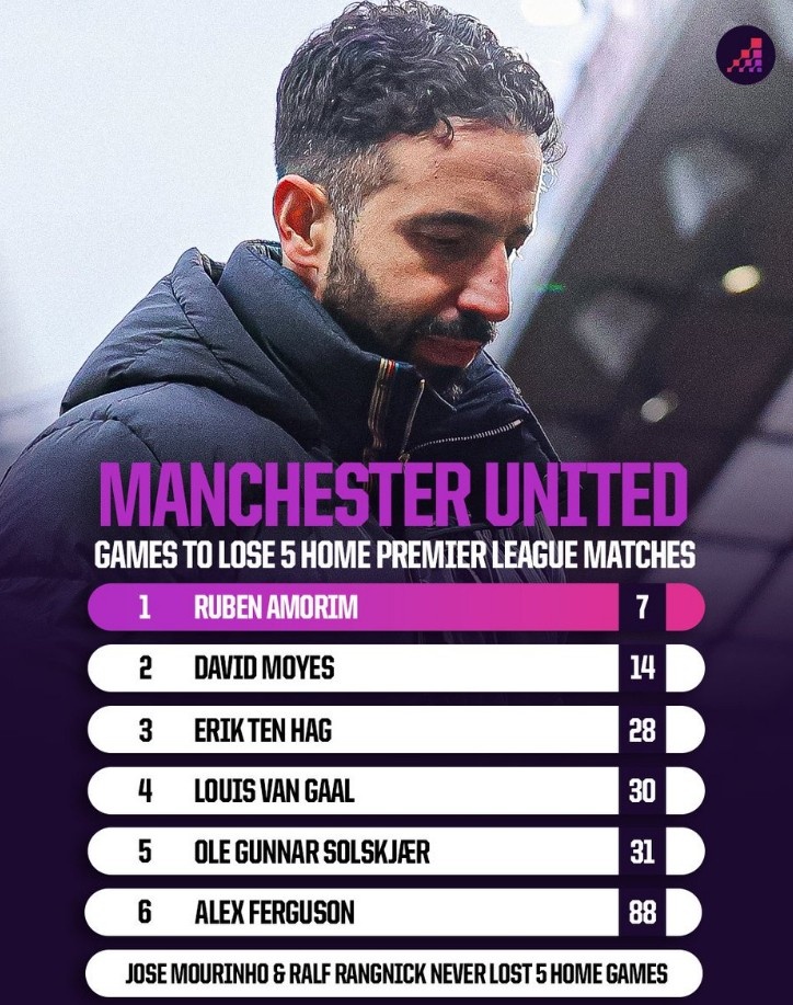 2月3日訊 在本輪英超,曼聯(lián)0-2不敵水晶宮,阿莫林執(zhí)教球隊(duì)7個英超主場輸?shù)?場。