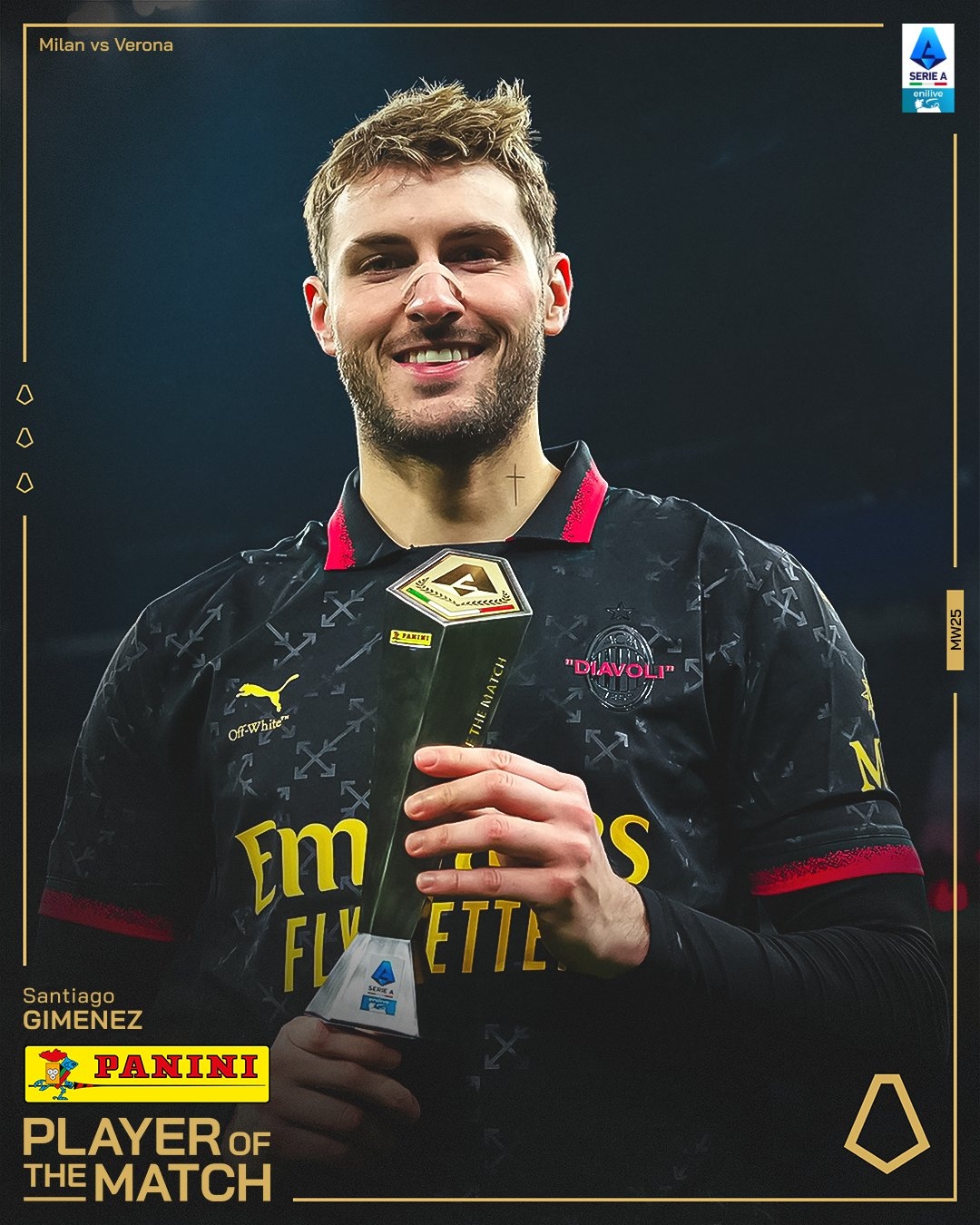 此役S-希門尼斯為米蘭攻入制勝進球,意甲官方宣布,他當(dāng)選本場比賽全場最佳球員。