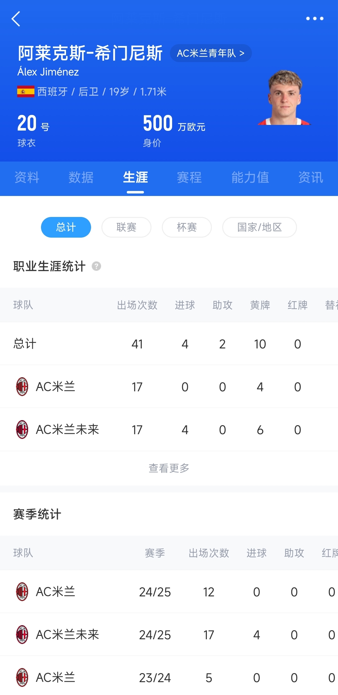 2024年夏窗,希門尼斯以500萬歐元的買斷費(fèi)正式從皇馬加盟米蘭,簽約至2028年。本賽季希門尼斯已經(jīng)代表AC米蘭出戰(zhàn)12場比賽,出場時(shí)間685分鐘。