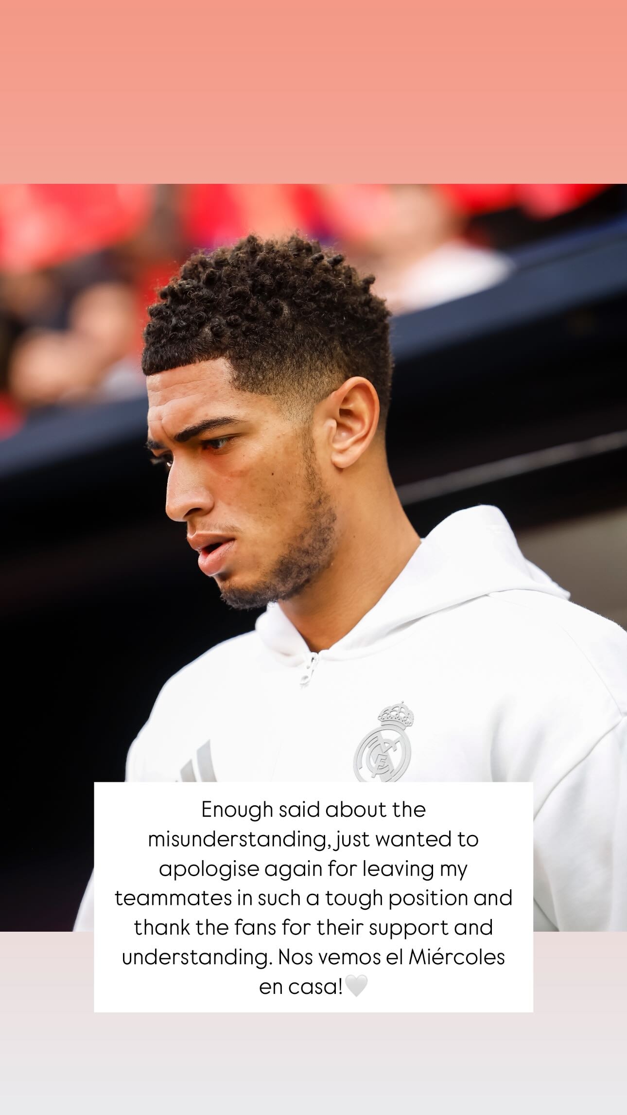 貝林厄姆:“關(guān)于這場誤會(huì),已經(jīng)說得夠多了,現(xiàn)在我只想再次為讓隊(duì)友們陷入如此艱難的境地而道歉, 也感謝球迷們的支持與理解。周三主場見(歐冠對陣曼城)!”