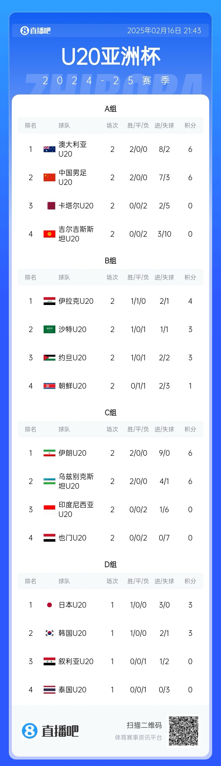 02月16日訊 U20亞洲杯B組第二輪戰(zhàn)罷,各隊(duì)排名形勢(shì)撲朔迷離,最后一輪將直接對(duì)話競(jìng)爭(zhēng)出線名額。