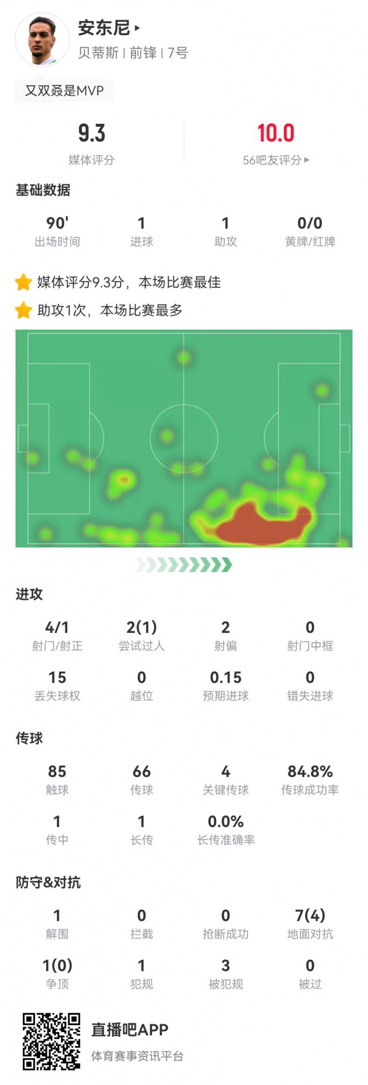 2月17日訊 貝蒂斯在本輪西甲3-0完勝皇社,安東尼本場數(shù)據(jù)如下: