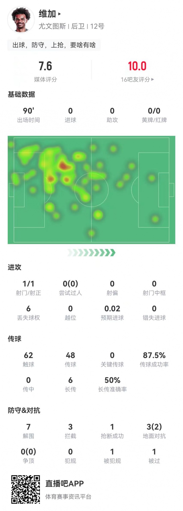 2月17日訊 尤文在本輪意甲1-0擊敗國米,維加本場數(shù)據(jù)如下: