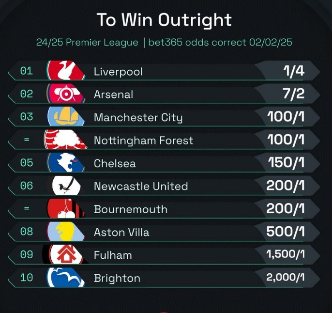 在最新的本賽季英超奪冠賠率中,利物浦仍居首,利物浦、阿森納已經(jīng)遙遙領(lǐng)先并列第三的曼城,具體如下: