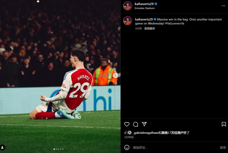 哈弗茨曬出自己進(jìn)球后滑跪慶祝的照片,并寫道:收獲一場大勝,現(xiàn)在迎接下一場重要的比賽!