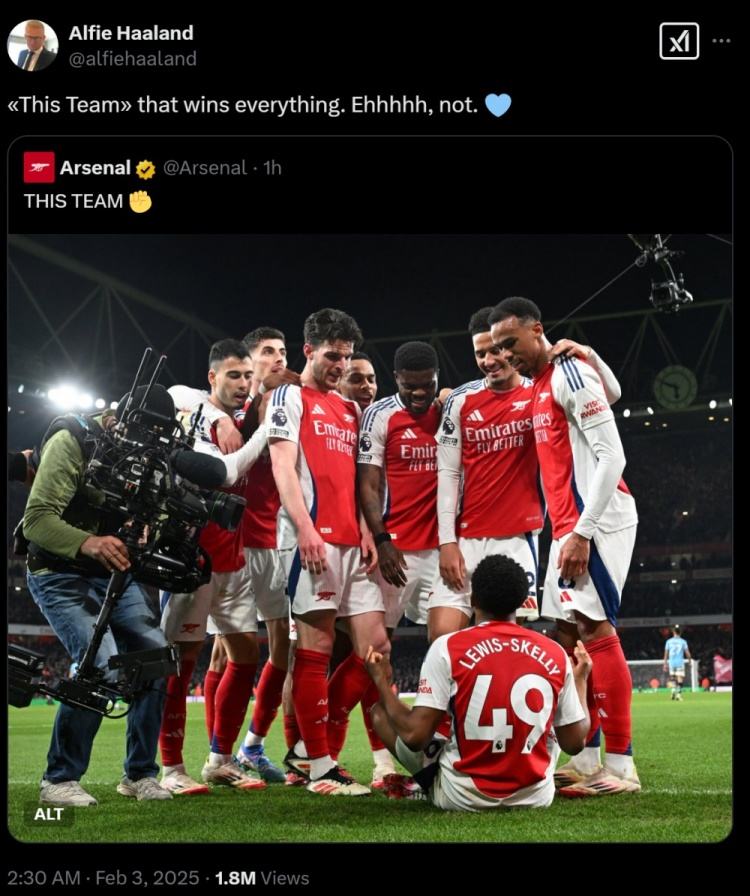阿森納社媒曬出斯凱利模仿哈蘭德慶祝時(shí),其余球員圍繞著他的照片,并寫道:這支球隊(duì)。