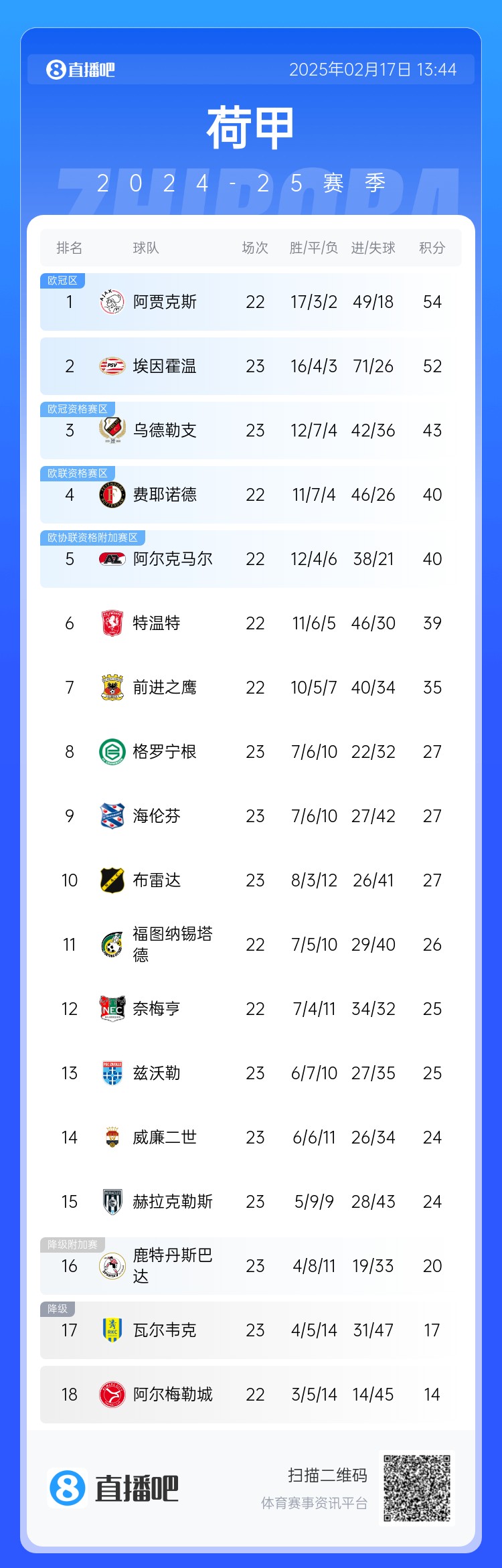 02月17日訊 荷甲第23輪,阿賈克斯4-0大勝赫拉克勒斯,聯(lián)賽7連勝的同時,在少賽一輪的情況下,2分領(lǐng)跑荷甲。
