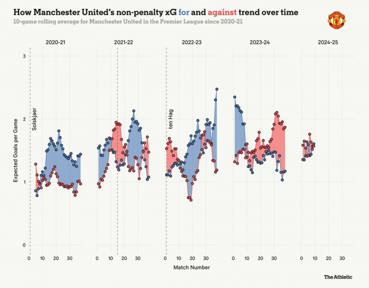 2020/2021賽季以來,曼聯(lián)非點球預(yù)期進(jìn)球數(shù)和丟球數(shù)的對比