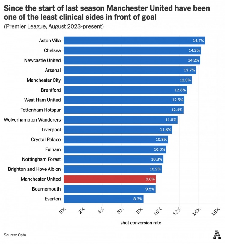上賽季以來,曼聯(lián)就是英超射門轉(zhuǎn)化率最低的球隊之一