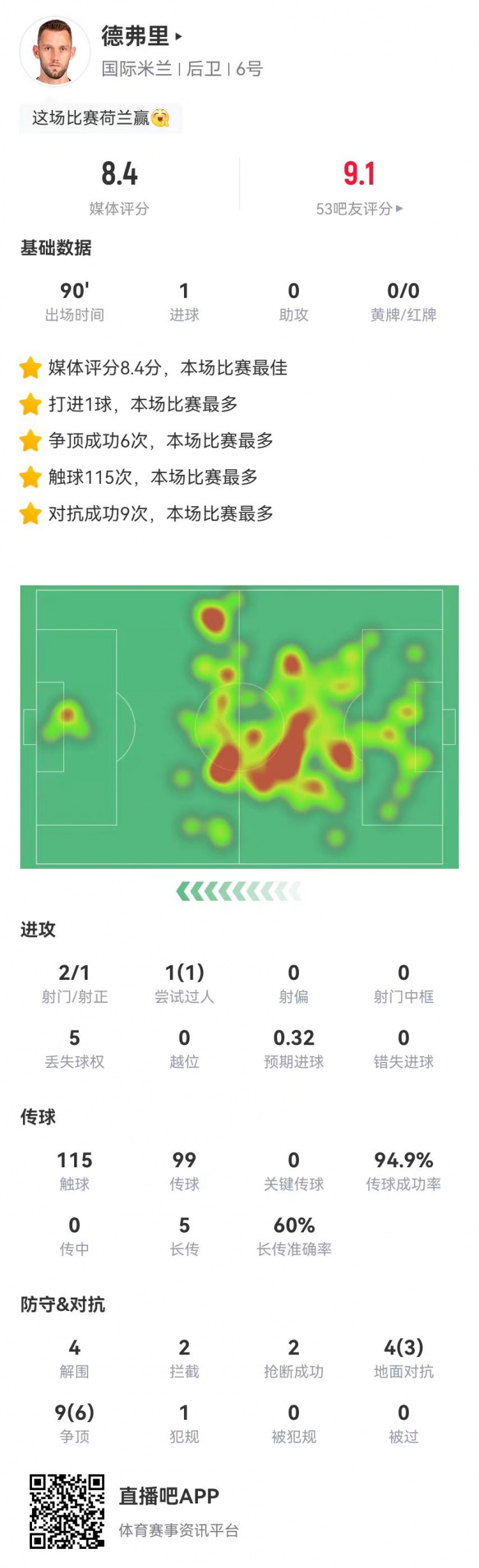 2月3日訊 國米在本輪意甲絕平米蘭,德弗里本場數(shù)據(jù)如下: