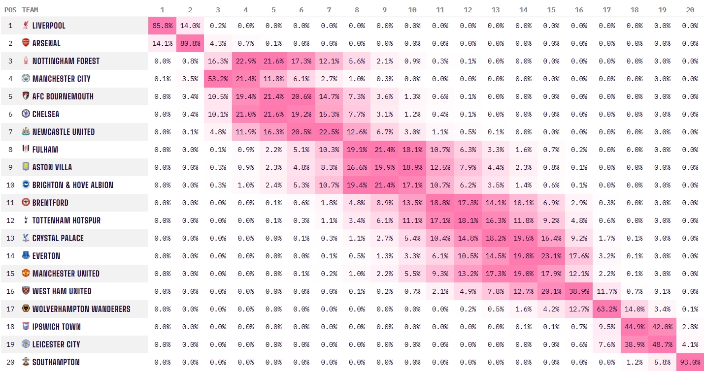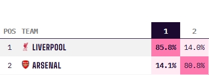 最新演算結(jié)果顯示,利物浦的奪冠概率為85.8%,大幅領(lǐng)先于阿森納的14.1%。