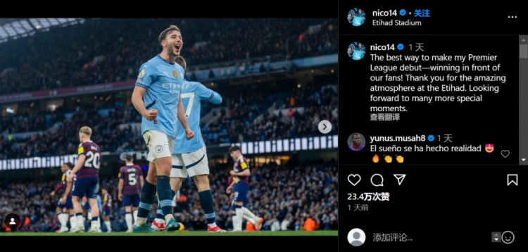 賽后這名中場在社媒發(fā)文紀(jì)念自己的英超首秀:在我們的球迷面前贏下比賽,這是我英超首秀的最佳方式。感謝伊蒂哈德營造的不可思議的氛圍,期待更多特別的時刻。