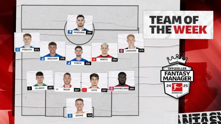 中場:波拉特(基爾)、比紹夫(霍芬海姆)、斯塔赫(霍芬海姆)、維爾茨(勒沃庫森)、拉爾森(法蘭克福)