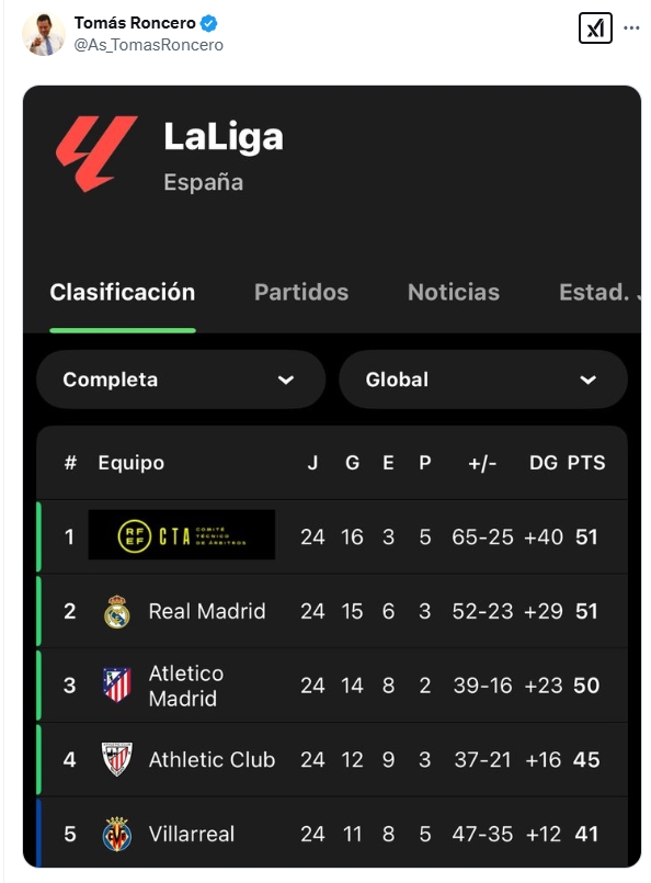 龍賽羅在社媒曬出最新積分榜,將榜首的巴薩的隊徽換成了裁判技術委員會的標志。
