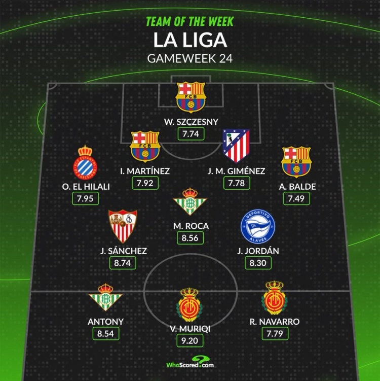 2月18日訊 WhoScored評選出了本輪西甲比賽的最佳陣容,安東尼入選。