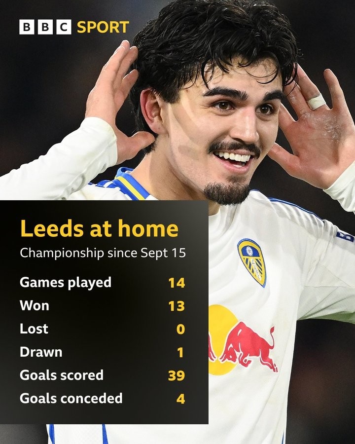 BBC統(tǒng)計(jì)表明,近14個(gè)英冠主場(chǎng),利茲聯(lián)13勝1平保持不敗,期間狂轟39球只丟4球,沖超的勢(shì)頭似乎已經(jīng)無人能擋。