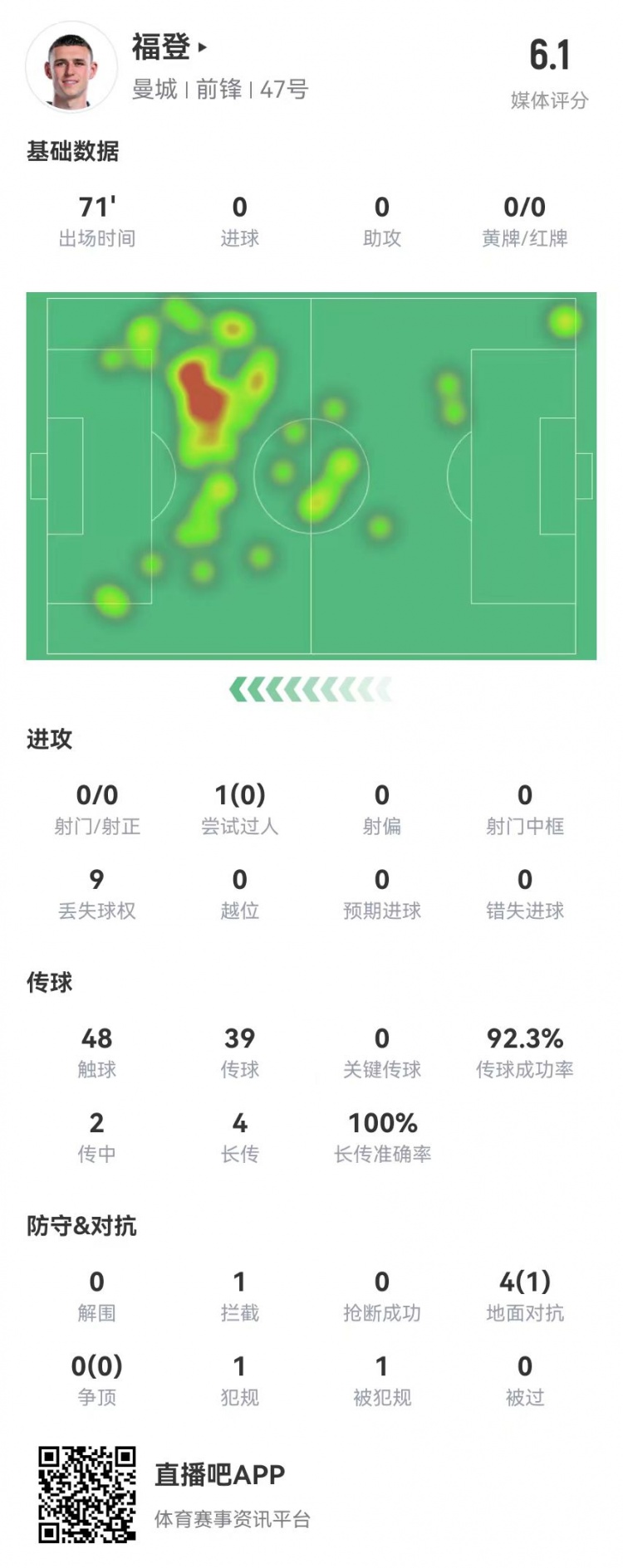 2月3日訊 阿森納在本輪英超主場對陣曼城,福登本場數(shù)據如下: