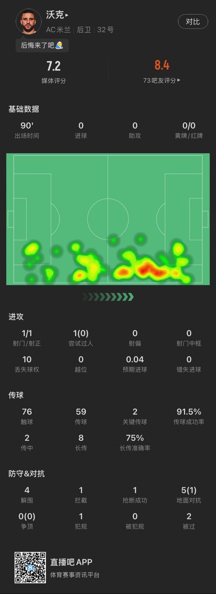 2月19日訊 在剛剛結(jié)束的歐冠淘汰賽階段附加賽中,米蘭1-1戰(zhàn)平費(fèi)耶諾德,總比分1-2出局。本場(chǎng)比賽,34歲的沃克打滿全場(chǎng),獲評(píng)7.2分。