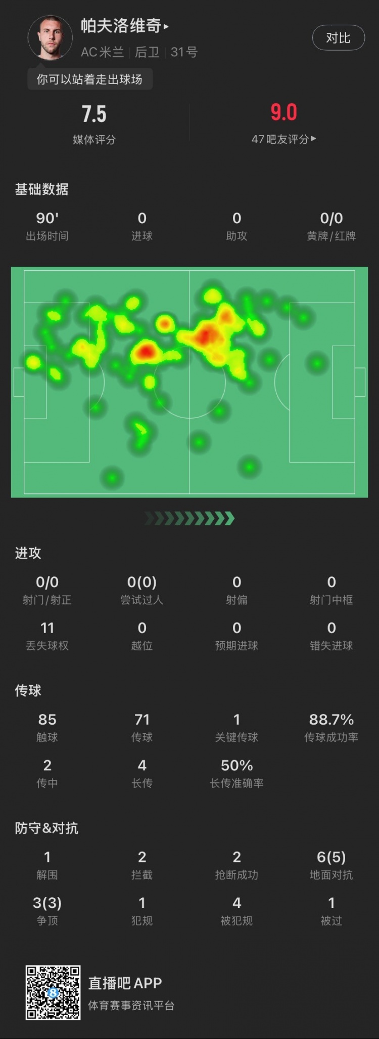 帕夫洛維奇本場(chǎng)主要數(shù)據(jù)↓