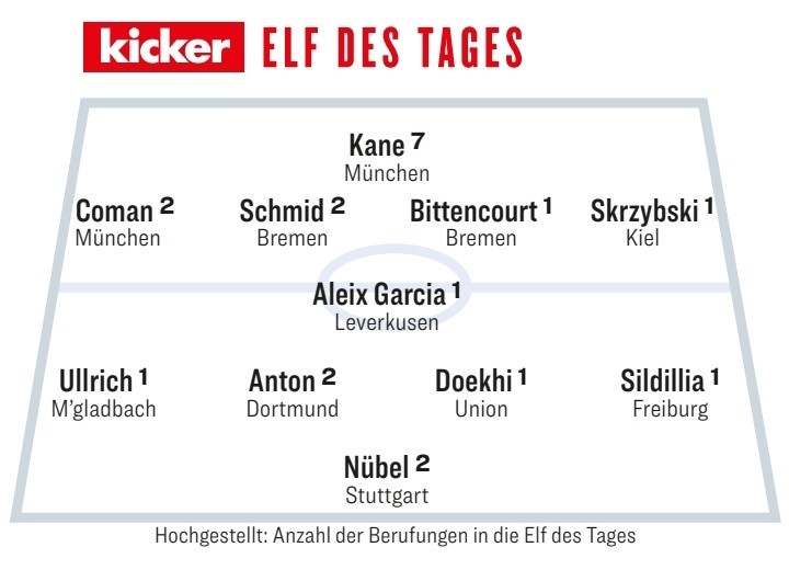 2月3日訊 德甲本輪比賽已經(jīng)全部完賽,《踢球者》也評出了本輪最佳陣容,拜仁和不萊梅各2將。