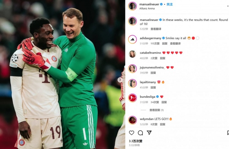 諾伊爾曬出自己和進(jìn)球功臣戴維斯的合照,并配文:“在最近幾周,結(jié)果才是最重要的。晉級16強(qiáng)!”