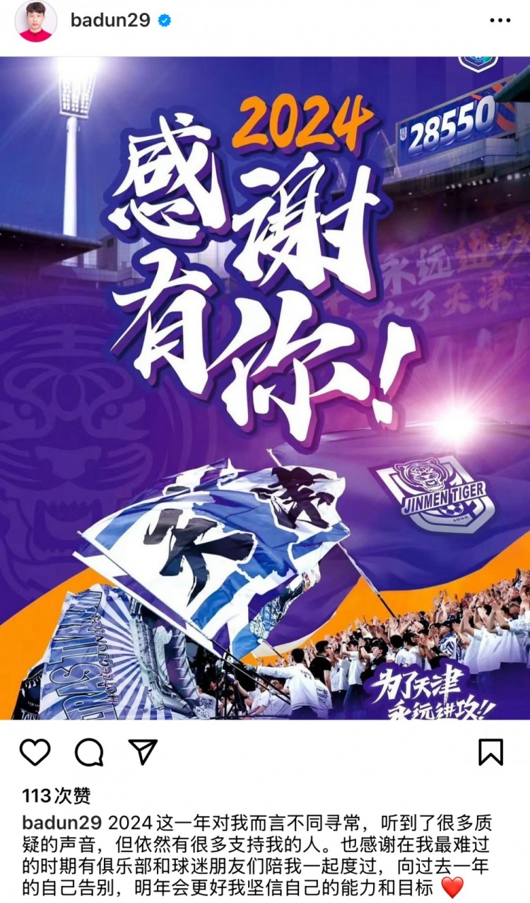 11月3日訊 昨天的本賽季中超末輪比賽結束后,津門虎球員巴頓更新社媒,對于已經(jīng)過去的2024賽季進行了總結。