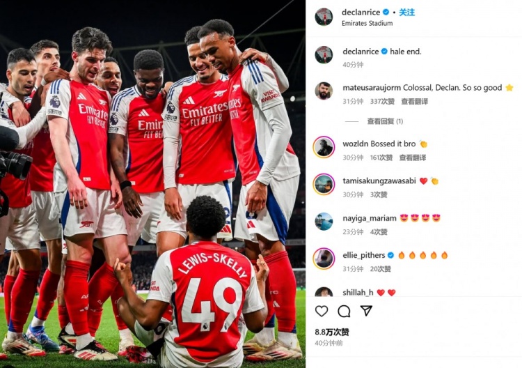 賴斯也在賽后通過社媒曬出自己和隊友們圍觀小將斯凱利打坐慶祝的照片,并配文:“黑爾恩德?!?/p>