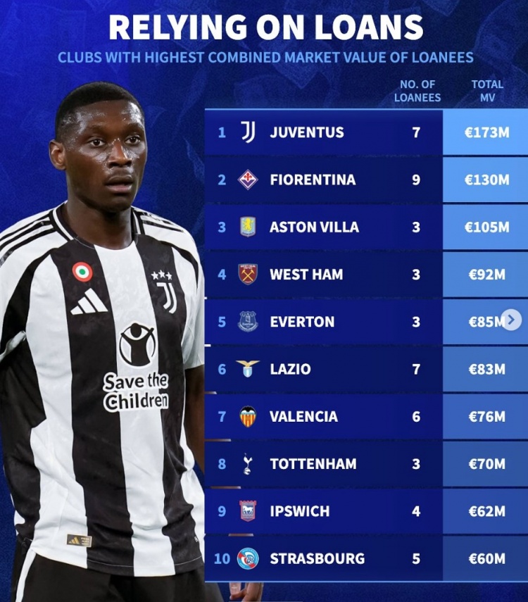 2月19日訊 《轉(zhuǎn)會市場》統(tǒng)計了當前隊內(nèi)租借球員身價最高情況,尤文以1.73億歐元居首。