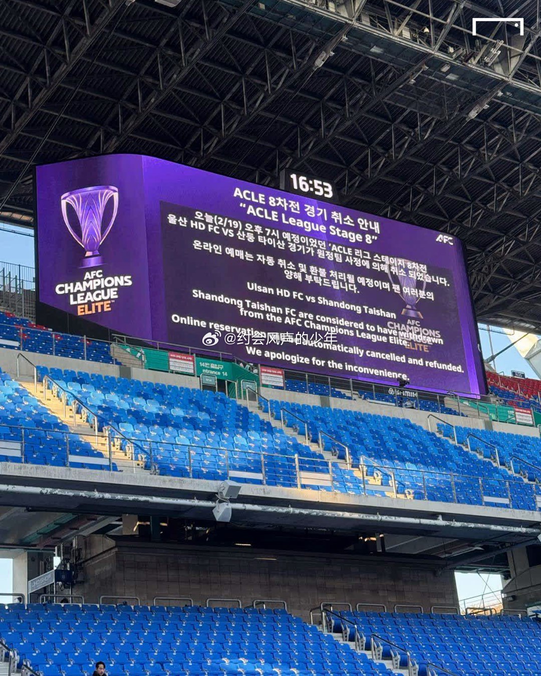 博主表示:“現(xiàn)場(chǎng)已經(jīng)有球迷進(jìn)場(chǎng),包括山東遠(yuǎn)征軍很早就被要求入場(chǎng),目前屏幕上打出了公告,并且要求球迷有序退場(chǎng)。