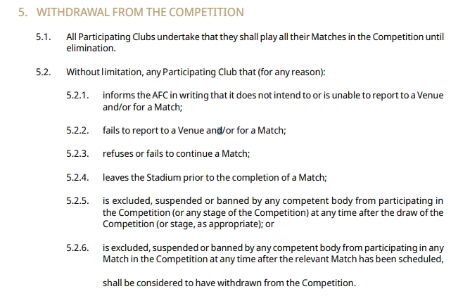 值得一提的是,亞足聯(lián)公告中是以《亞足聯(lián)冠軍聯(lián)賽精英賽2024/25競(jìng)賽規(guī)程》第5.2條款規(guī)定為根據(jù),確定山東泰山退出本屆亞冠精英聯(lián)賽。