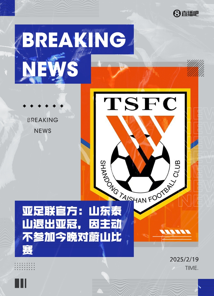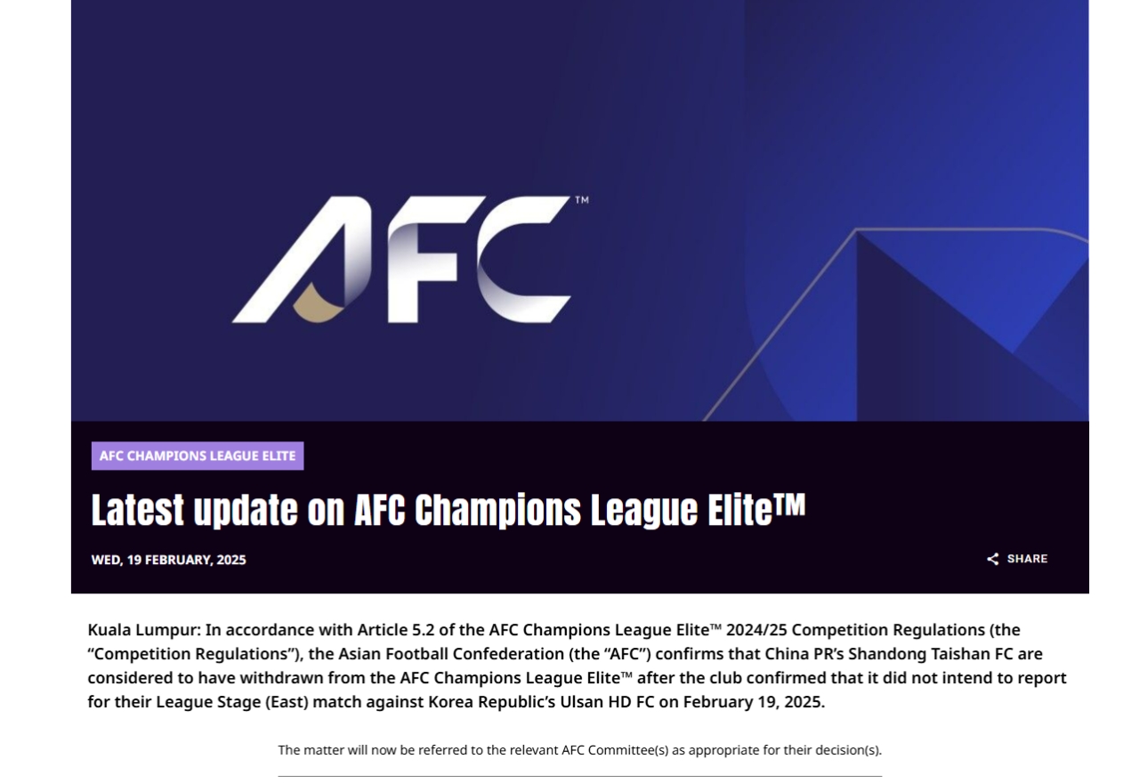 根據(jù)《亞足聯(lián)冠軍聯(lián)賽精英賽2024/25競賽規(guī)程》(簡稱"競賽規(guī)程")第5.2條款規(guī)定,亞足聯(lián)確認中國山東泰山足球俱樂部因明確表示不參加原定于2025年2月19日與韓國蔚山HD足球俱樂部進行的東亞區(qū)聯(lián)賽階段賽事,現(xiàn)被視為退出本屆亞足聯(lián)冠軍聯(lián)賽精英賽。