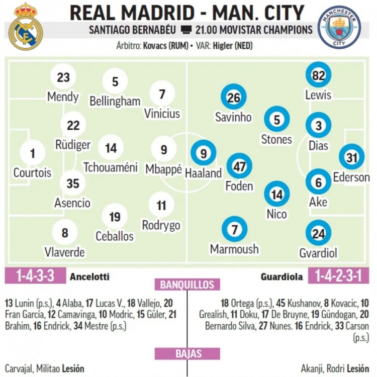 西班牙媒體《馬卡報》預(yù)測了兩隊此役的首發(fā)陣容,皇馬中衛(wèi)組合為呂迪格+阿森西奧,巴爾韋德出任右后衛(wèi)。曼城方面馬爾穆什、尼科-岡薩雷斯、劉易斯首發(fā)。