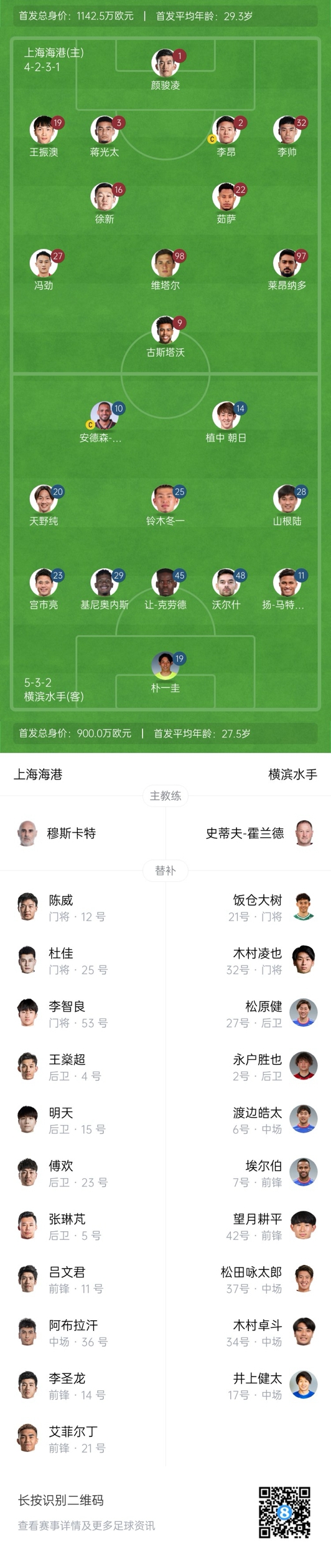 上海海港首發(fā):1-顏駿凌、2-李昂、3-蔣光太、19-王振澳、32-李帥、16-徐新、22-茹薩(F)、98-馬特烏斯-維塔爾(F)、9-古斯塔沃(F)、27-馮勁、97-萊昂納多(F)