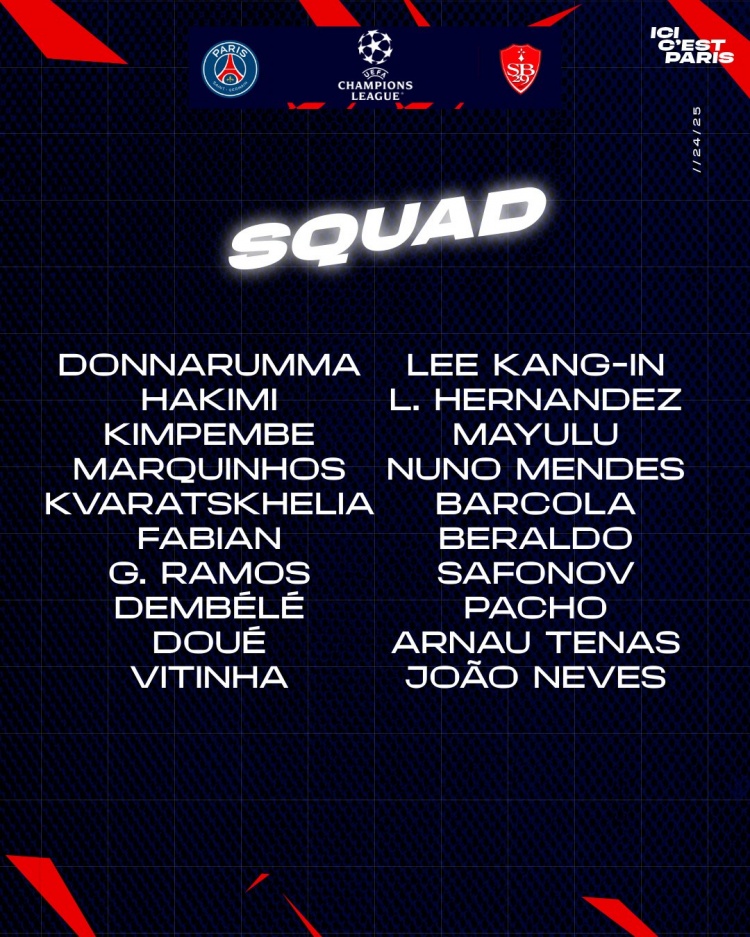 2月19日訊 北京時間明天凌晨4點,巴黎將在歐冠淘汰賽附加賽次回合比賽中主場對陣布雷斯特,首回合巴黎3-0取勝。巴黎公布了此役的球員名單,多納魯馬回歸,登貝萊、克瓦拉茨赫利亞、阿什拉夫在列,扎伊爾-埃梅里繼續(xù)缺席。